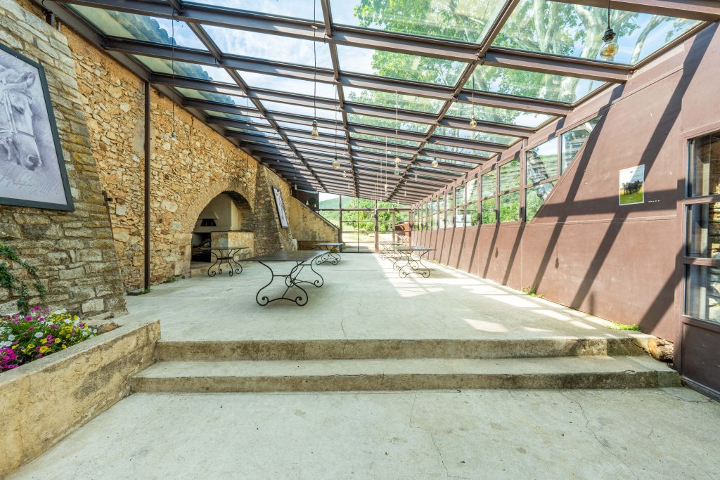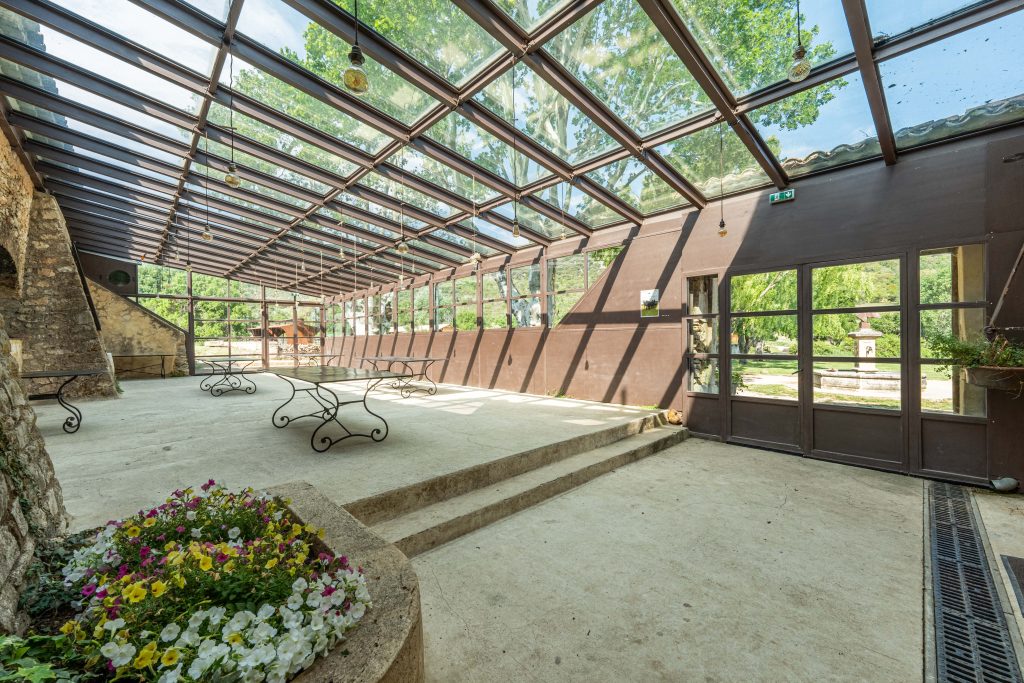 La verrière mêle le style industriel chic à la chaleur des matériaux locaux. Parfaite pour un dîner raffiné, un cocktail ou une piste de danse, elle s’adapte à toutes vos envies tout en offrant une vue imprenable sur le parc, la nature environnante et le village de Simiane La Rotonde.